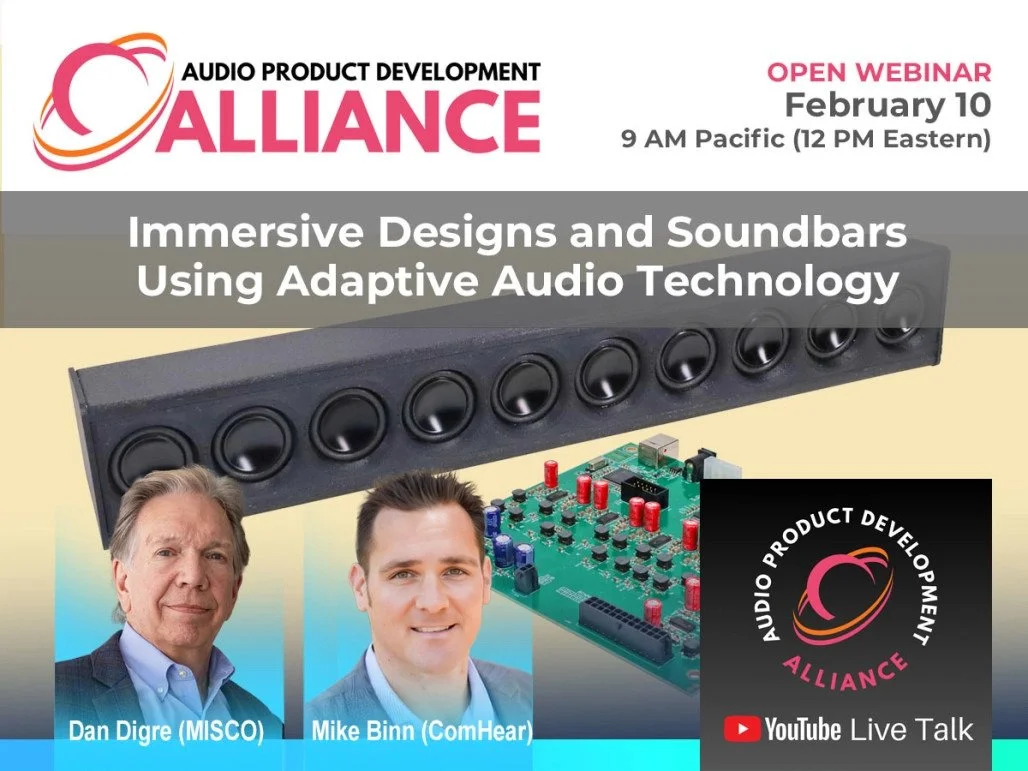 Finally, as if we could forget, the latest webinar from the Audio Product Development Alliance (APDA) was held earlier this month. Visit the audio alliance’s YouTube channel to watch APDA Webinar #15, “Immersive Designs and Soundbars Using Adaptive Audio Technologies” with MISCO’s Dan Digre (who previously joined us for Webinar #5) and ComHear’s Mike Binn. This latest edition of the webinar series comes on the heels of a successful APDA presence at ISE Barcelona at the start of the month.